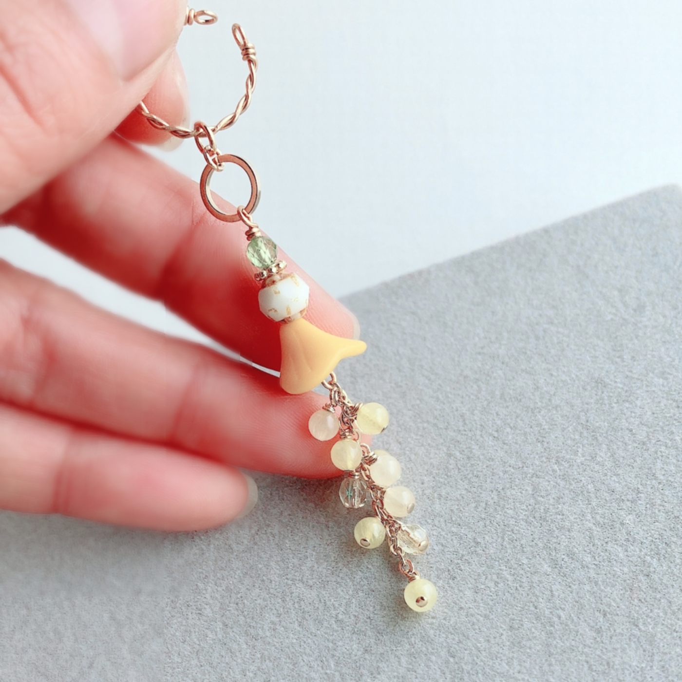 ペリドット(ラウンドカット) チェコガラスビーズ(3種) メタルパーツ(2種)・チェーン |